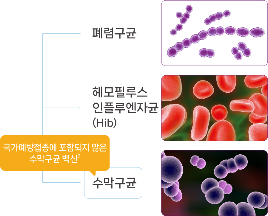 세균성 뇌수막염의 원인균은 수막구균, 폐렴구균, B형 헤모필루스 인플루엔자균(Hib) 입니다.1 이 중 폐렴구균 및 Hib와 달리, 수막구균 백신은 어린이 국가예방 접종(NIP)에 포함되지 않습니다.2